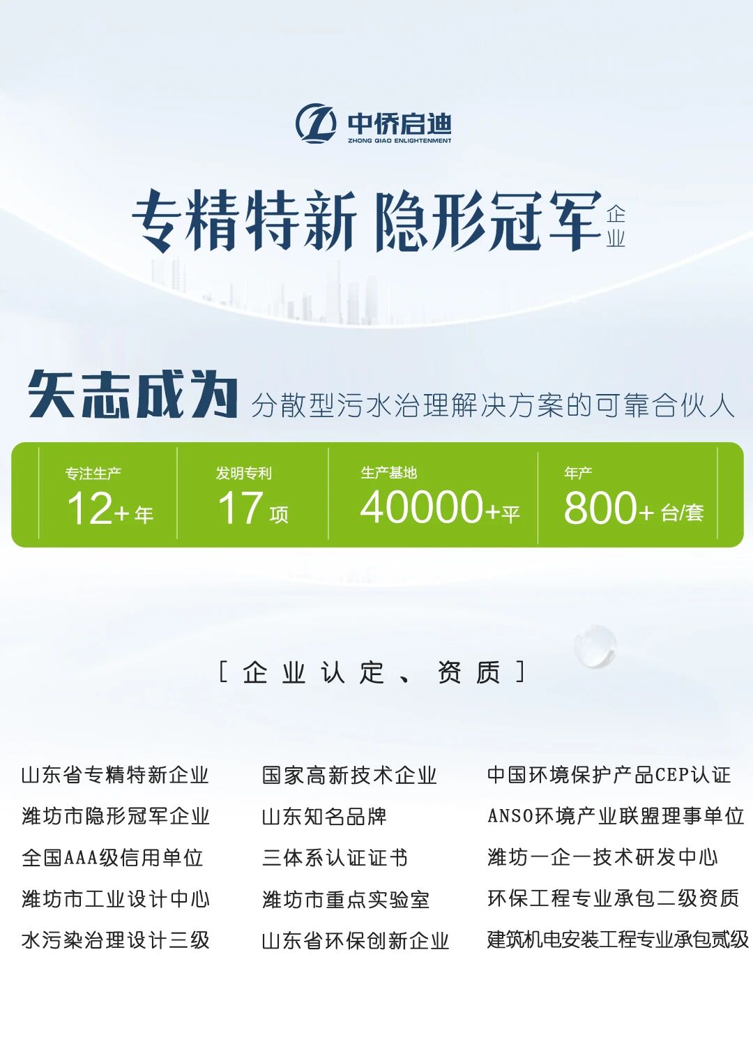 未来,中侨启迪将继续秉持“为分散型用户提供最优质的水污染解决方案及配套装备”的企业使命,积极参与行业标准体系建设,推动污水处理行业高质量发展,为我国生态文明建设与绿色发展贡献力量。